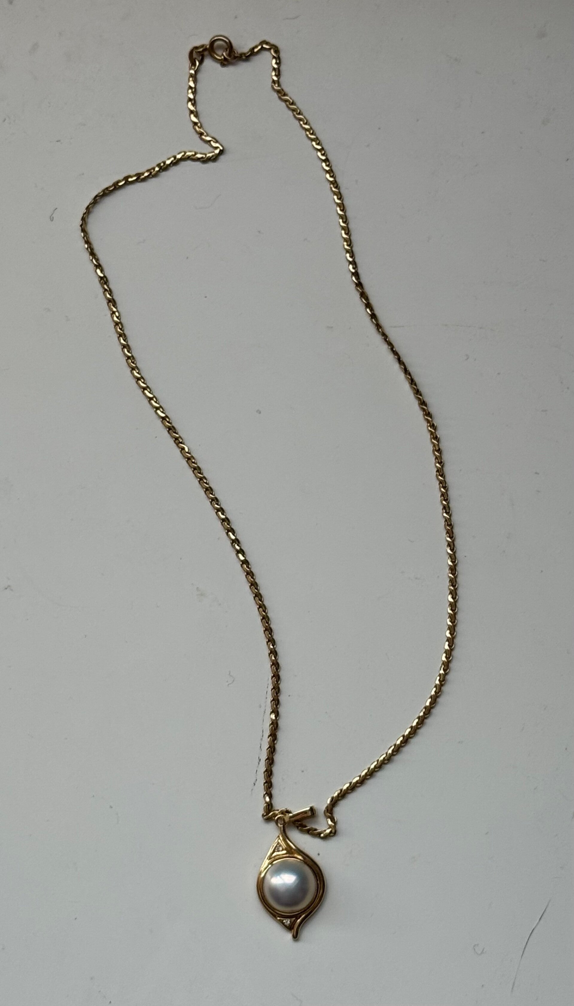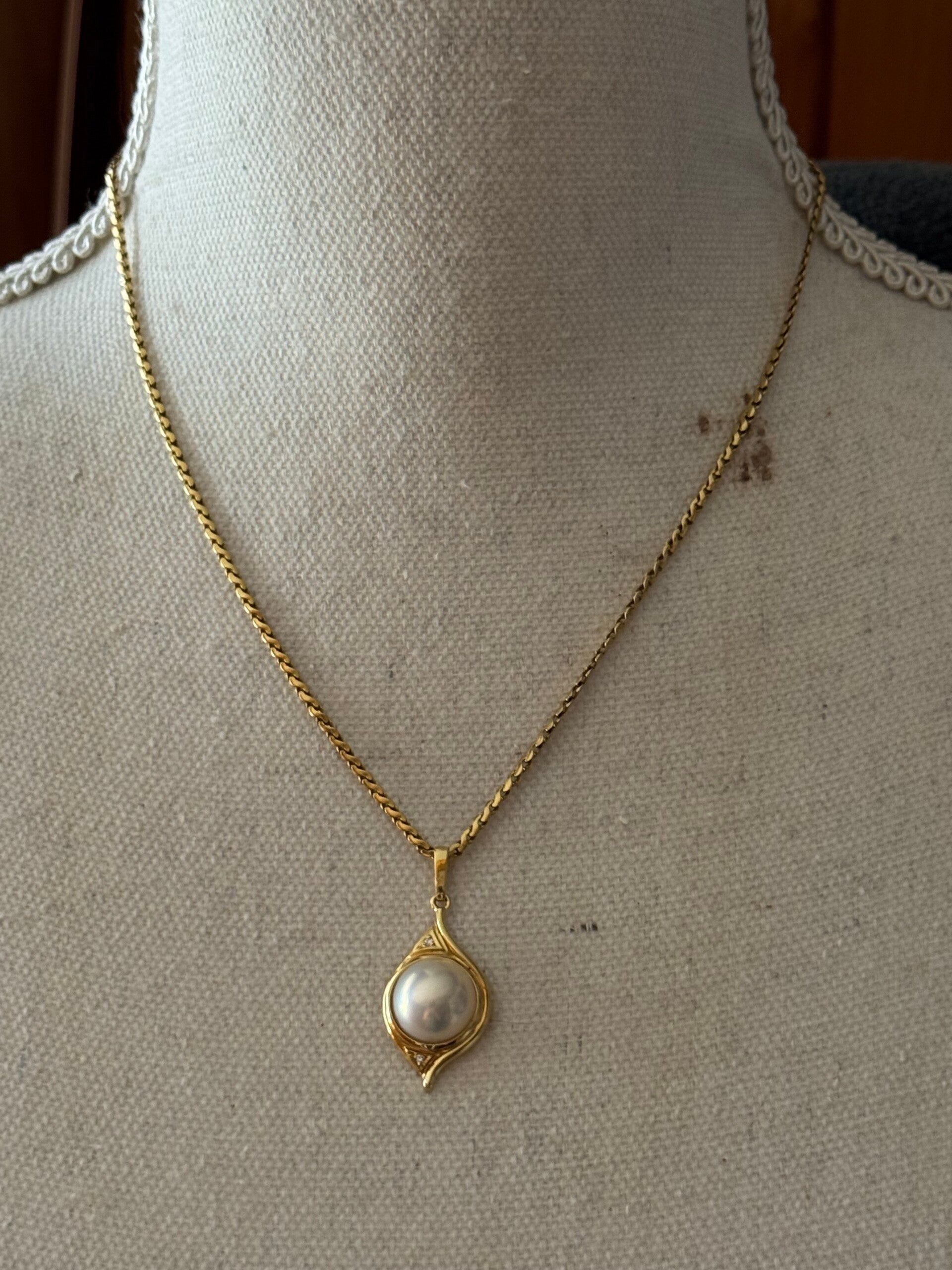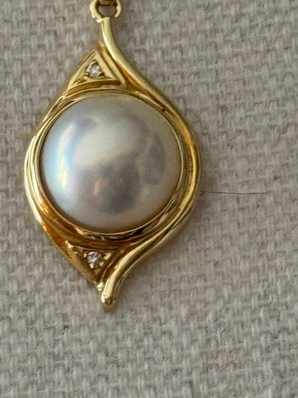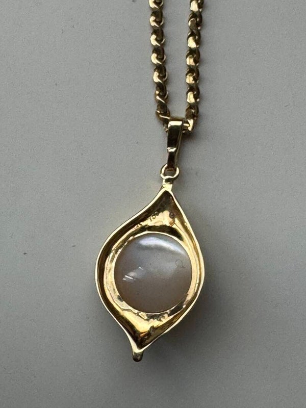 Diese wunderschöne Kette kommt aus der Schweiz. Der Anhänger ist ein Rätsel - ist es ein Mondstein oder eine Perle? Ich kann es nicht sagen und der Goldschmied der sie mir vor 40 Jahren verkauft hat, lebt nicht mehr. Es hat 2 Diamanten - getestet und schöner alter Schliff.