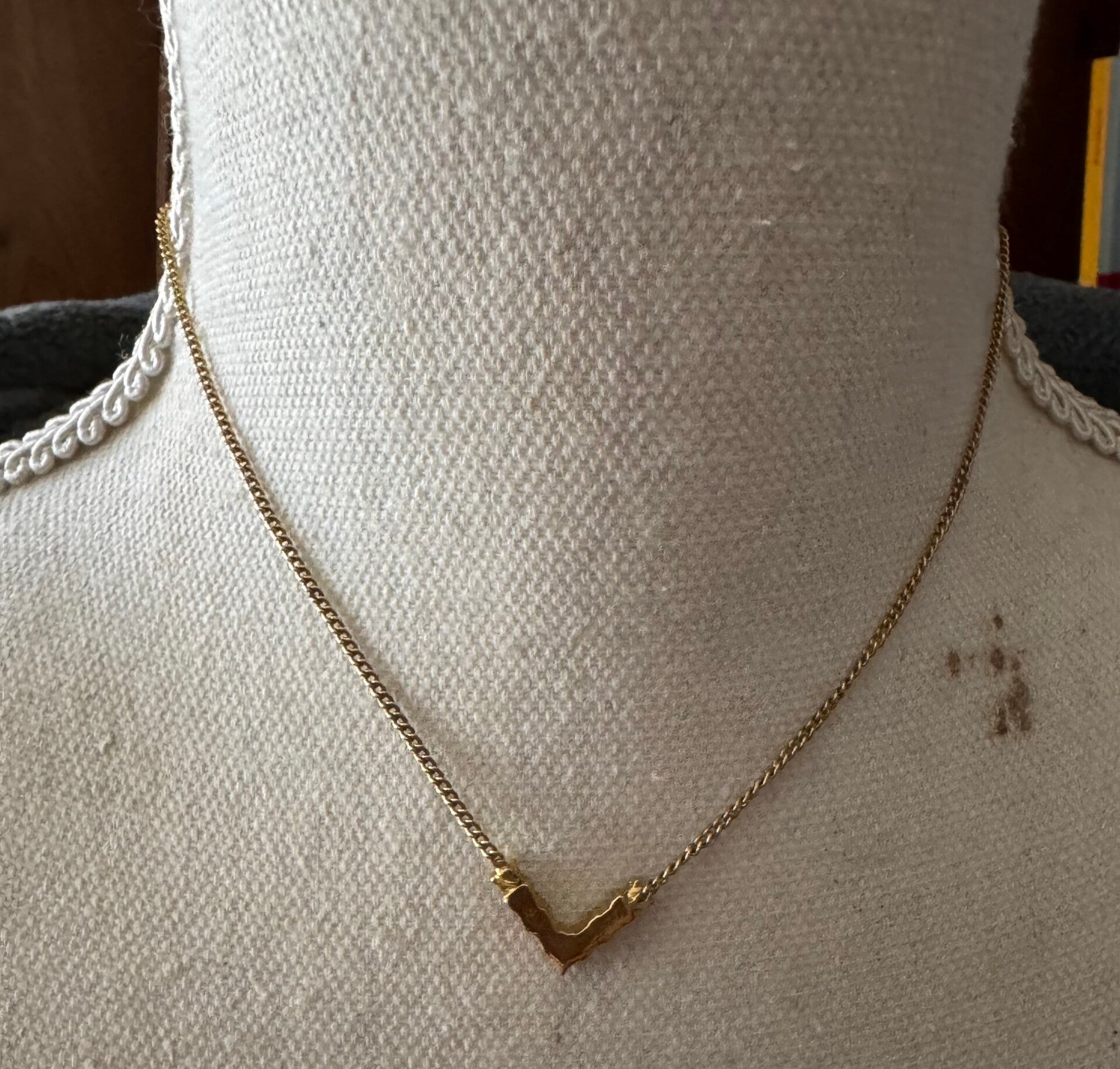 Diese Halskette war in einem Schmuckkasten aus England. Sie hat offensichtliche Gebrauchsspuren. Sehen Sie dazu die Fotos an. Sie stammt aus 1980 und hat 7 Kristalle mit schönem Schliff eingesetzt. Ansonsten scheint sie vergoldet zu sein. Sie ist fest und hält einiges aus.