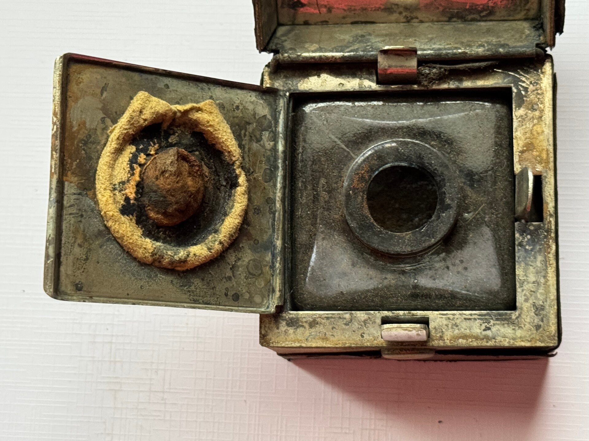 Dieses Tintenfass sollte sprechen können. Was würde es wohl uns erzählen. Gehörte es einem Offizier oder Diplomaten oder vielleicht einem Schriftsteller? Es ist aus Metall und ist mit Patentleder überzogen. Wie Sie auf den Bildern sehen, ist das Leder nicht mehr intakt, aber das Glas vom Tintenfass ist und der Rest funktioniert auch.