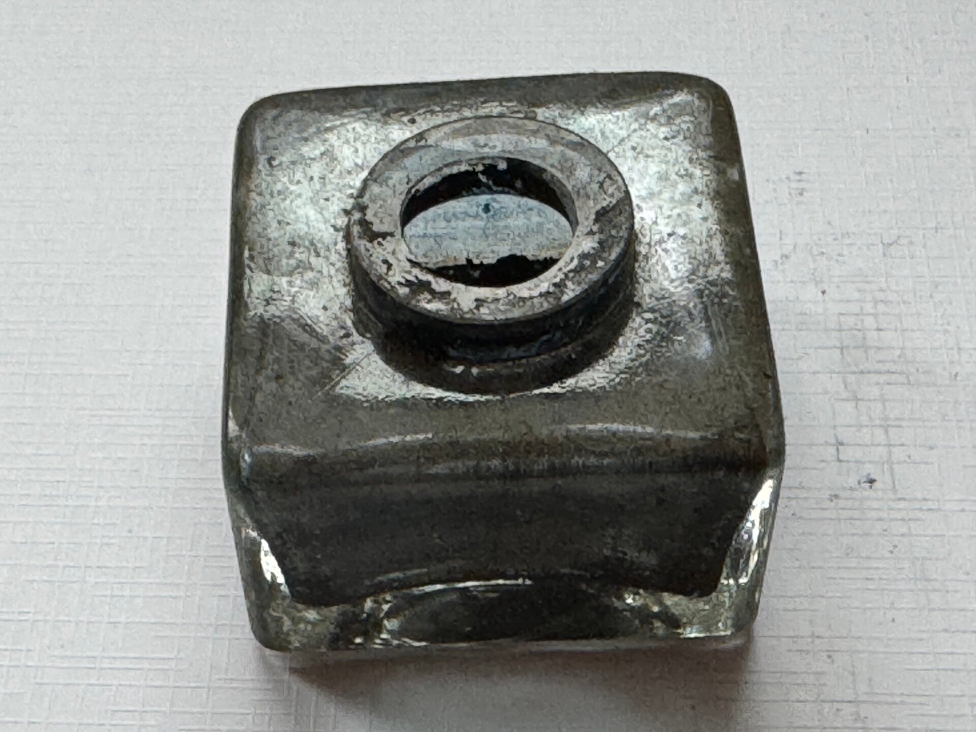 Tintenfass für die Reise aus Metall, Glas und Leder ca 1870